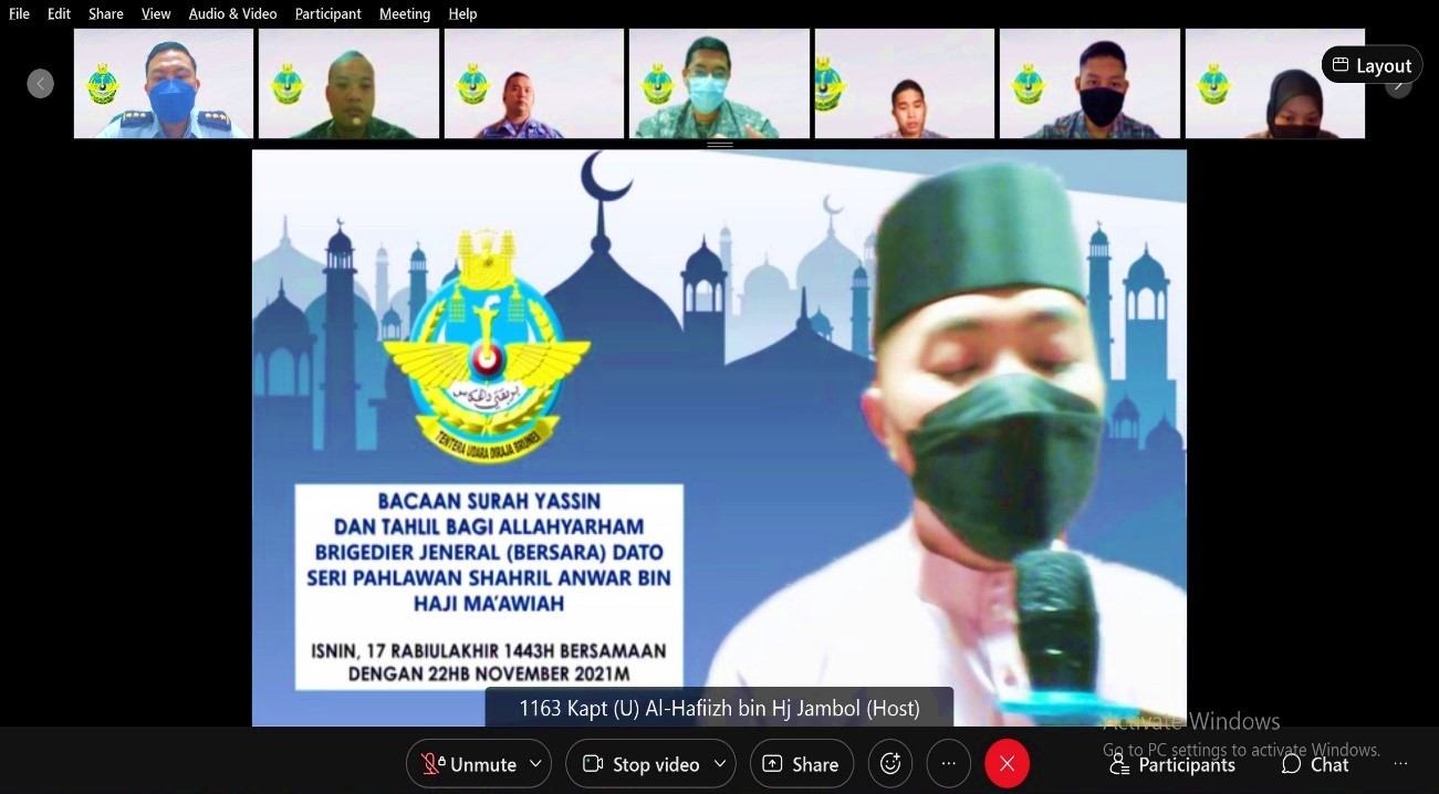 Bandar Seri Begawan, Monday, 22 November 2021 – The RBAirF held a recitation of Surah Yaasin and Tahlil ceremony for Allahyarham Brigadier General (RTD) Dato Seri Pahlawan Shahril Anwar bin Haji Ma'awiyah, Permanent Secretary, Ministry of Defence who passed away on Friday, 19 November 2021. The ceremony was conducted virtually throughout the RBAirF.